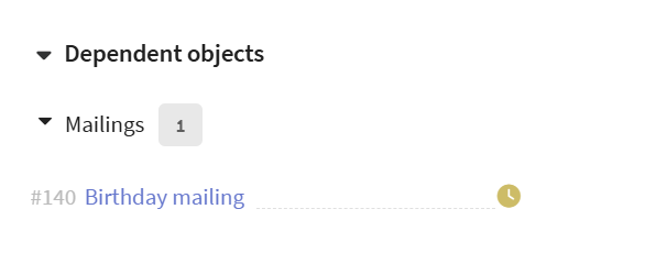 If the segment is used in other platform entities (mailings, scenarios, loyalty programs), the "Dependent Objects" block will appear below the update log: