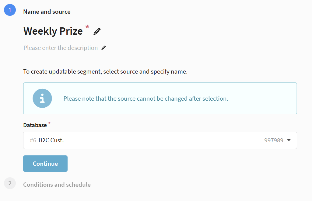In the scheduled segments list, click + Create. In the form that opens, specify the Name of the segment — this is a required field. Then select the segment source (Database). Segment creation is impossible without selecting a database: