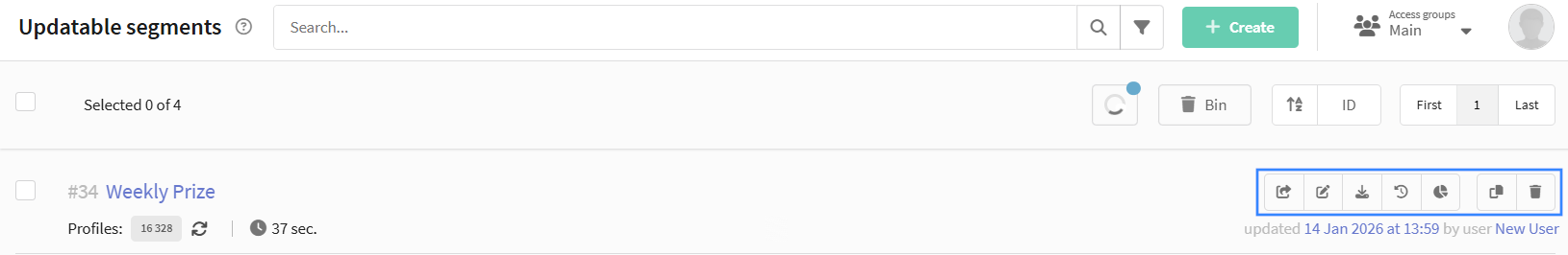After creating and saving the segment, its page will open. Now, in the upper right corner, next to the fields for tags and access groups, additional actions for working with the current profile selection become available: