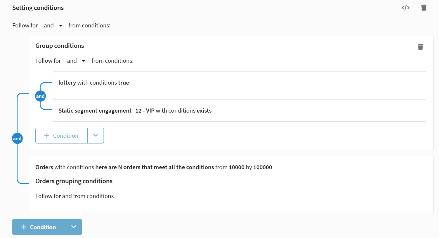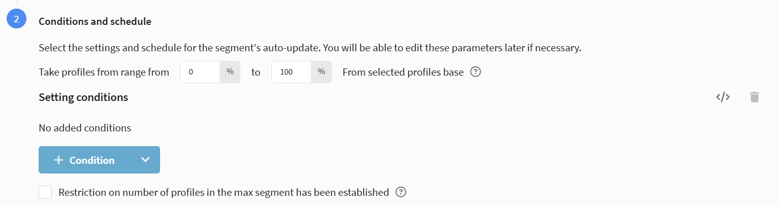 After configuring the conditions, you can set limitations by activating the checkbox "Set a limit on the maximum number of profiles in the segment" to specify a limit. This limitation is applied to the selection result after selection by range and conditions.