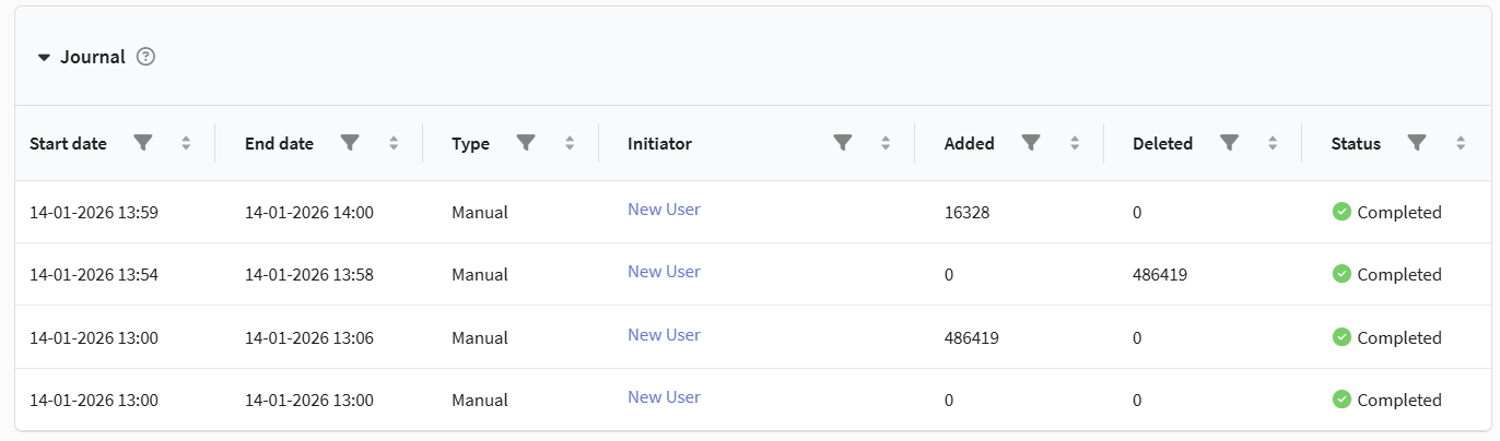 The "Log" block is a table with detailed information for each recalculation run. For each operation, the start and end date and time, type (Manual / Automatic), initiator (user or "System"), number of added and removed profiles, and status (In Progress, Completed, Error) are indicated.