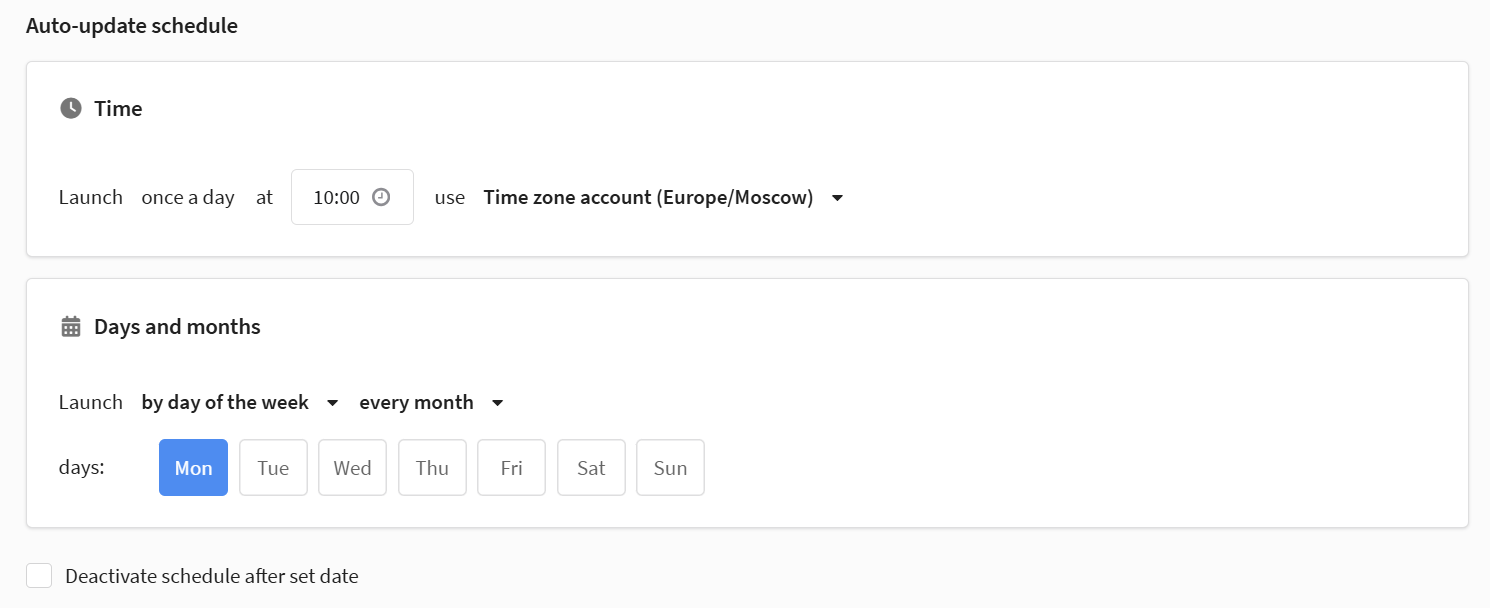 In the "Conditions and Schedule" block, configure the parameters for automatic updates. Specify the exact time for launch (HH:MM) and select the timezone. Then set the frequency of recalculation from the available options: daily, on a specific date, by time (days of the week, days of the month, etc.):