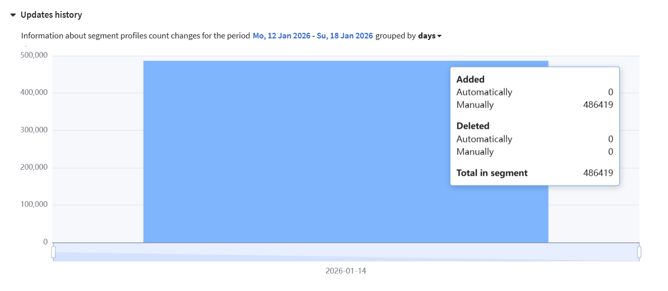The "Update History" block is a graph visualizing changes in the number of profiles in the segment over the selected period. The period can be set using the calendar or ready-made options (today, last 7 days, this month, etc.), and data can be grouped by days, weeks, months, quarters, or years. When hovering over a point on the graph, a breakdown by profiles is displayed: added or removed automatically and manually: