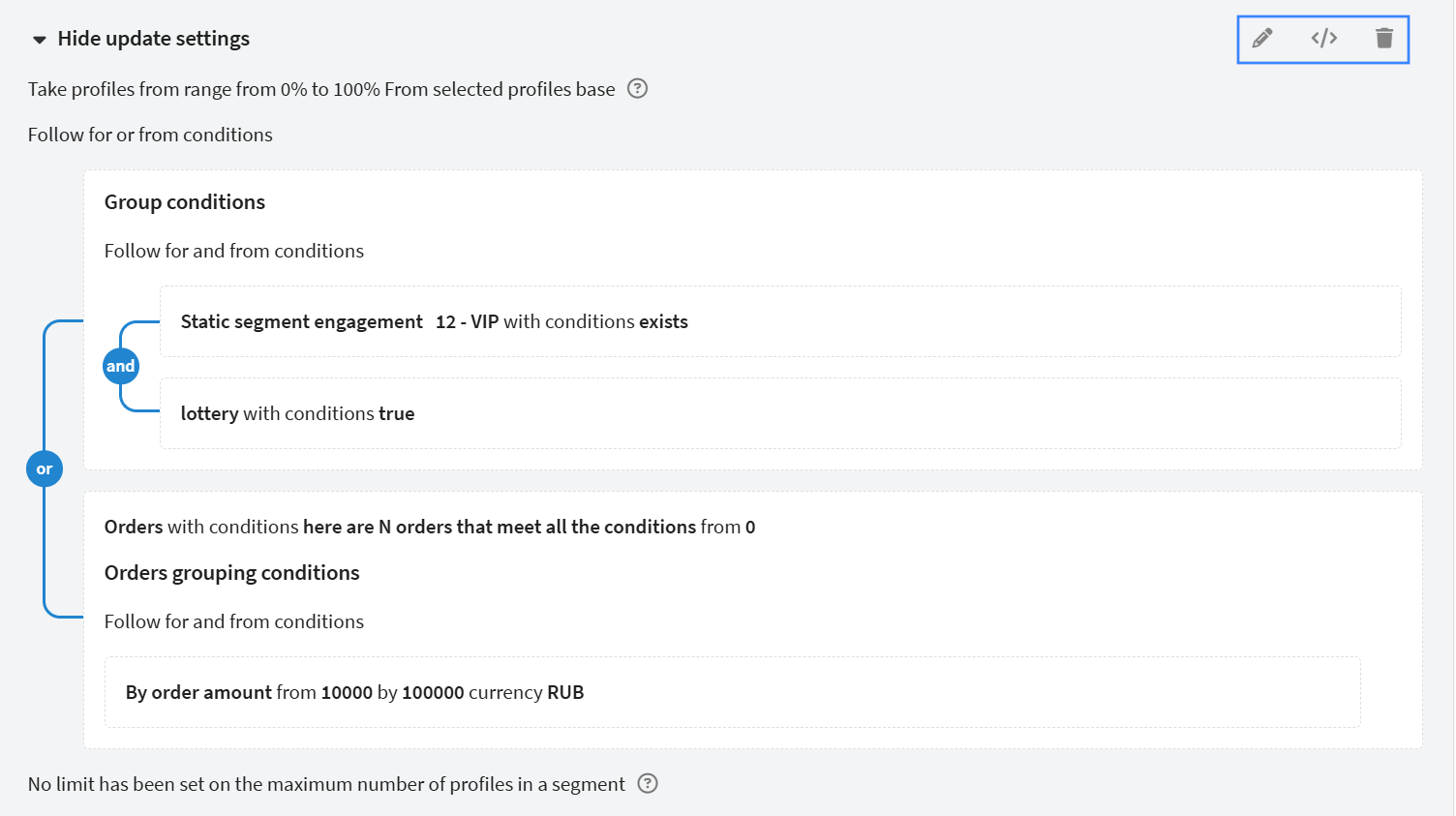 Limit — the maximum number of profiles that can be included in the segment. For example, if 1000 profiles match the segmentation conditions, and the limit is 400, then the first 400 profiles from the selection will enter the segment.