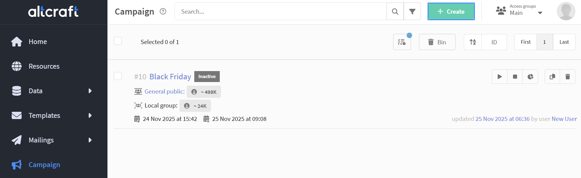 Campaigns are a tool for uniting marketing activities into a single strategy and managing them in one place. A campaign can contain broadcasts, regular and triggered mailings, scenarios, A/B tests and placements. You can configure test and control groups, track strategy performance and manage the lifecycle of activities from a single interface: