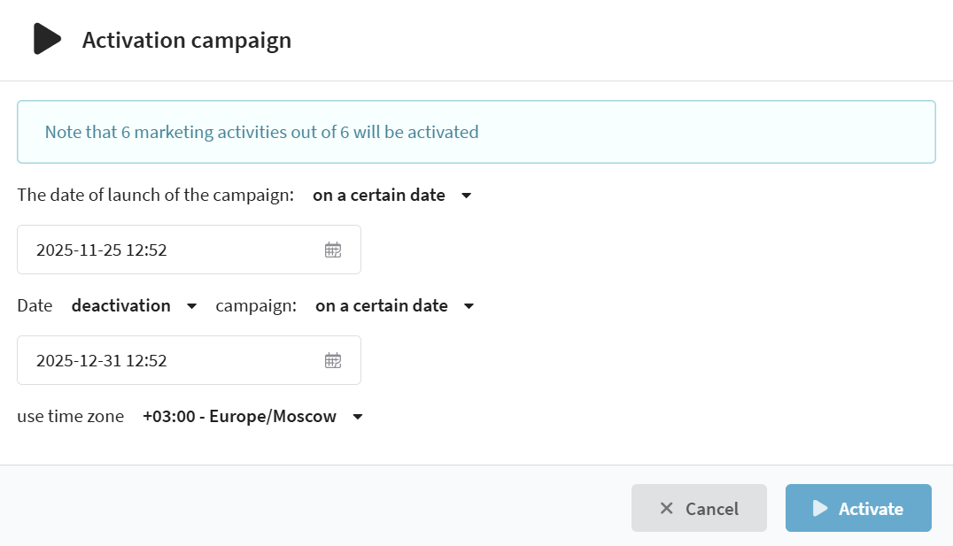 | Completed | The campaign is fully stopped. Activities no longer run, relaunch is impossible. |