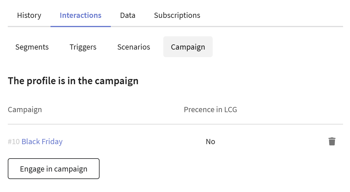 In the profile card → Interactions → Campaigns → choose campaign: