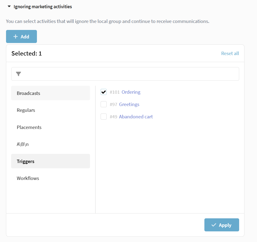 | Audience exclusion | The system removes profiles from the campaign and detaches them from scenarios. New mailings do not run. |