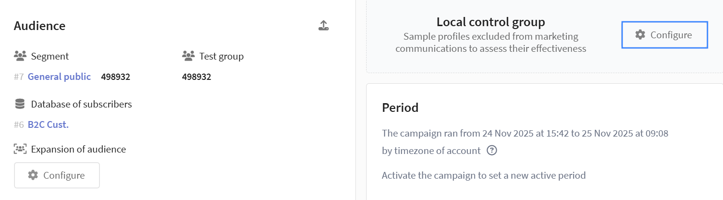 The Local control group (LCG) is a part of the audience that does not receive campaign activities. Used for precise audience control. LCG analytics is not available yet.