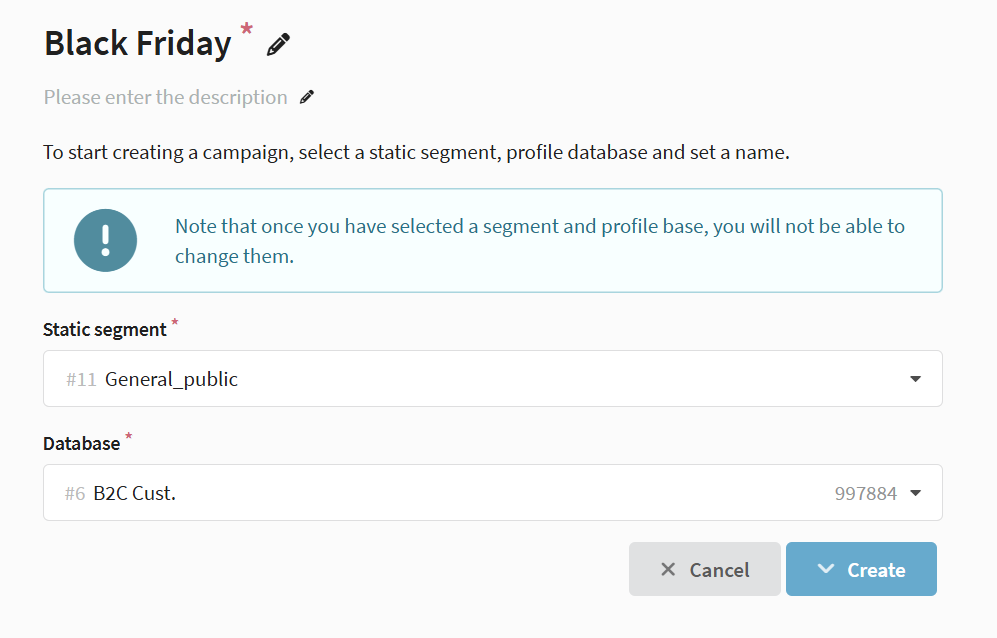 Before creating a campaign, prepare a static segment for the target audience. It defines who will join the activities.