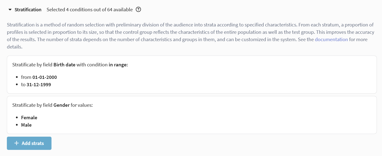 To do this, they select the Gender and Date of birth fields, define two date-of-birth ranges, and add gender values (male and female). The system will create four strata — men 20–25, women 20–25, men 25–40, and women 25–40 — and distribute participants between the test and control groups according to the configured settings.