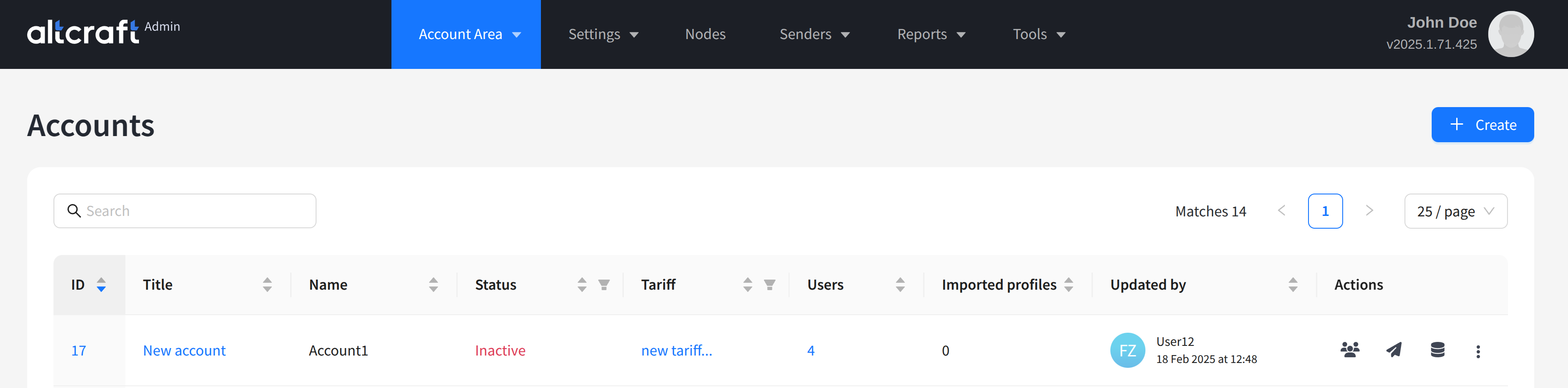 To edit an account, click its identifier on the left. To create a new account, click + Create.