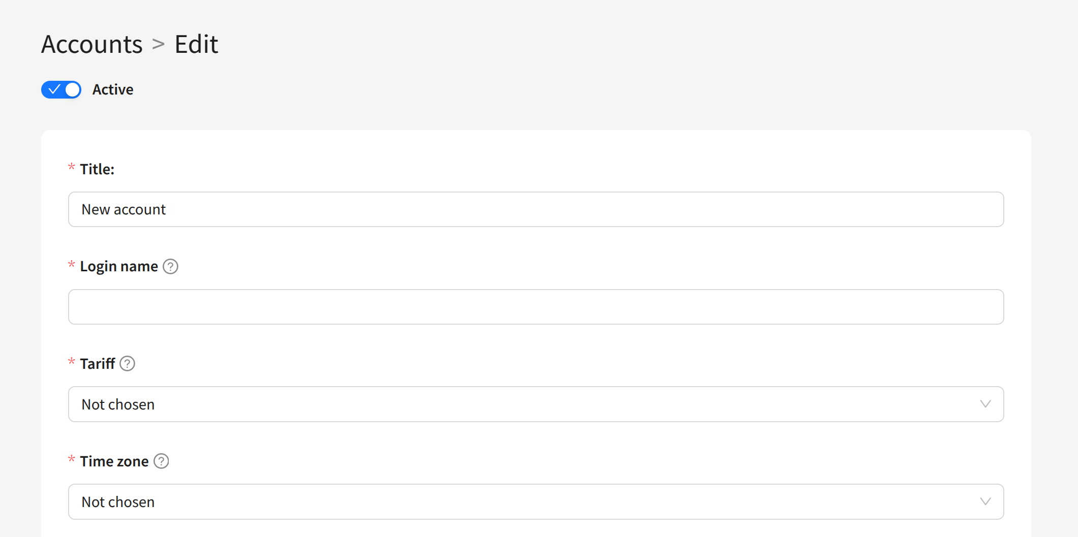 If needed, you can create an inactive account to activate it later when required. Use the Active/Inactive toggle at the top of the screen.