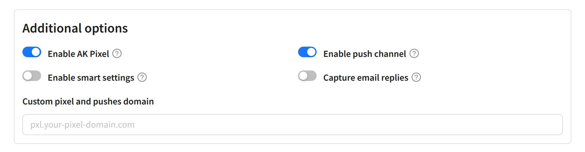 - Enable AK Pixel — enable tracking pixels for the account.