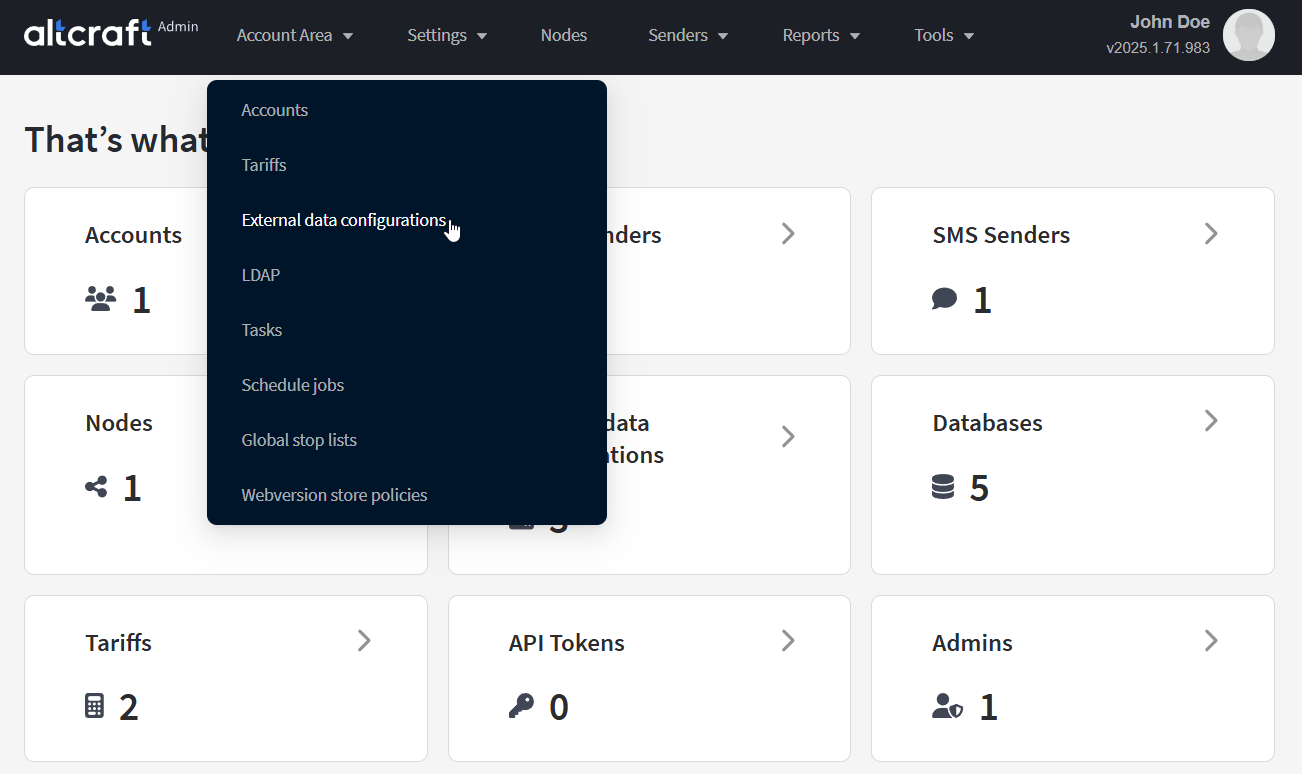 To manage external data source connections, in the main menu select Account Area — External data configurations.