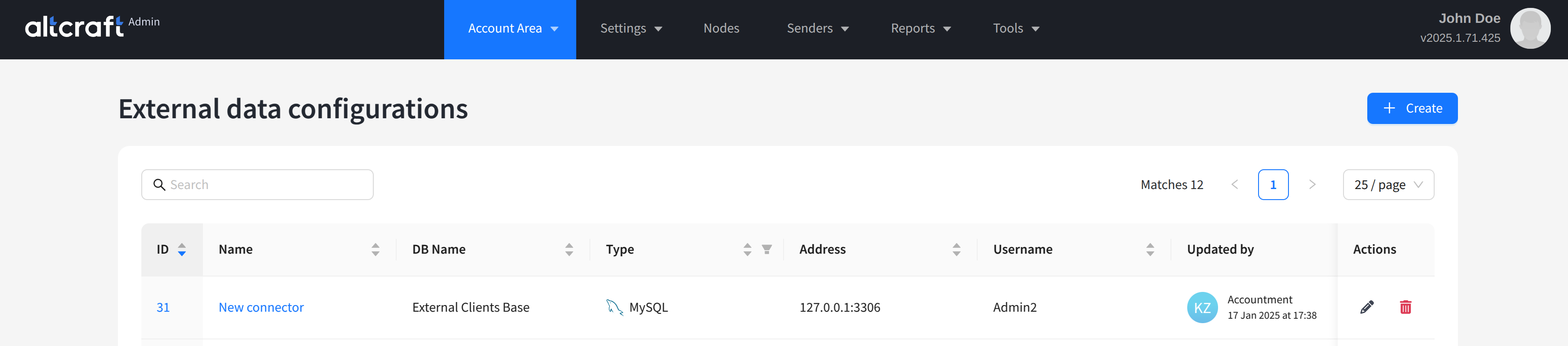The list displays existing connectors to external databases. On the right side of the table are the edit and delete buttons. You can also click the connector identifier on the left to edit. To create a new connector, click + Create:
