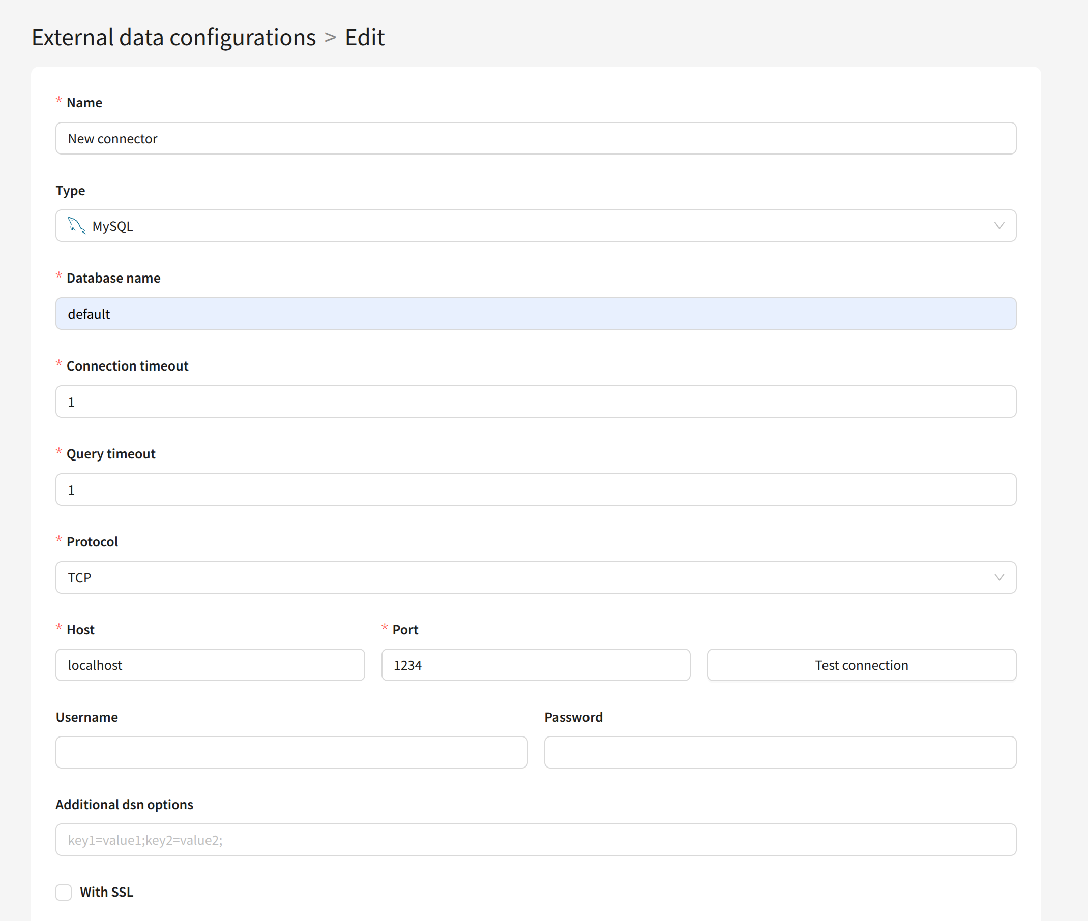 With SSL — connect the database to the platform via SSL connection. Available for MySQL, PostgreSQL, and ClickHouse.