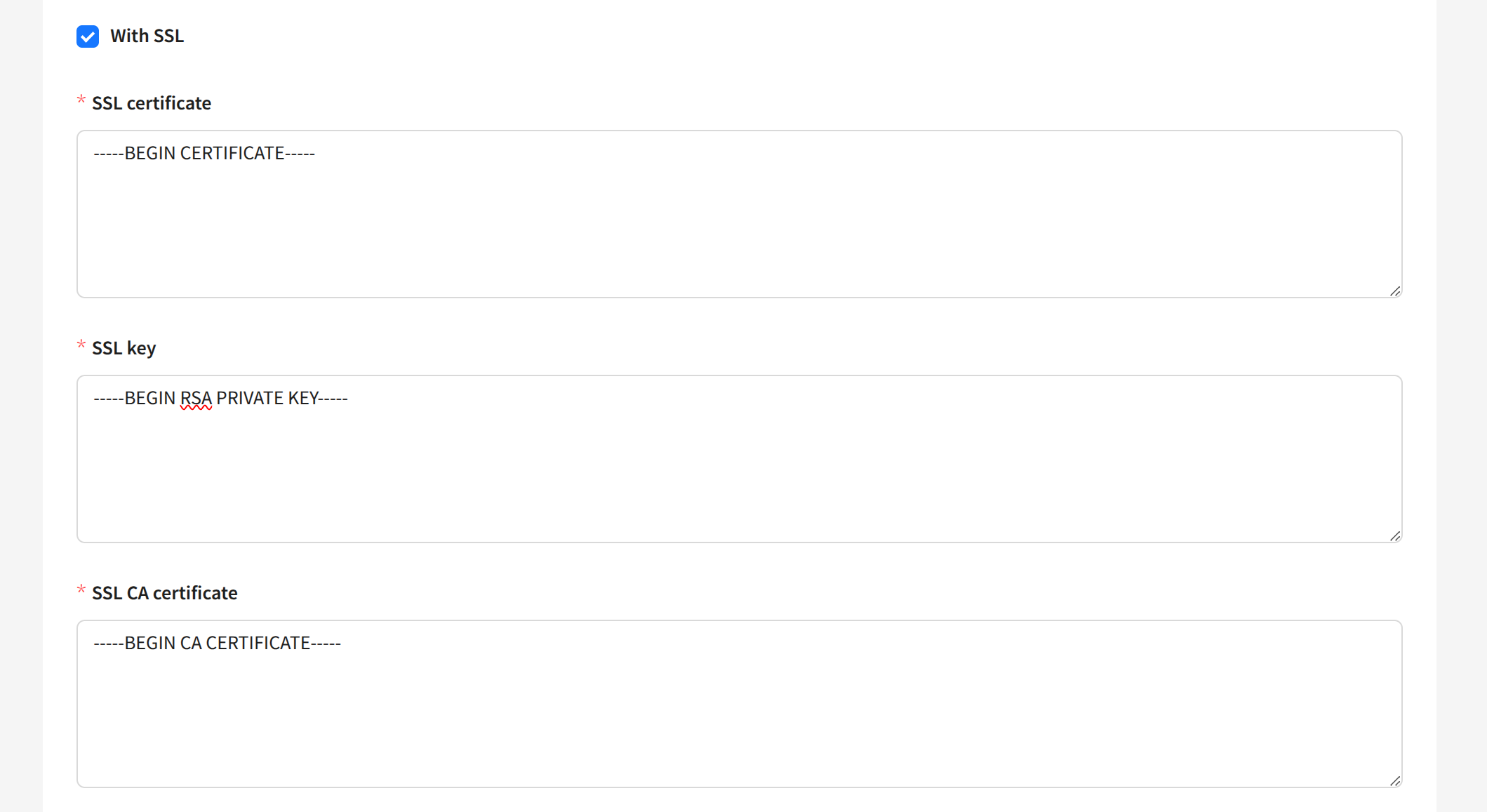 When using SSL connection, you must add an SSL certificate, SSL key, and SSL CA certificate in PEM format: