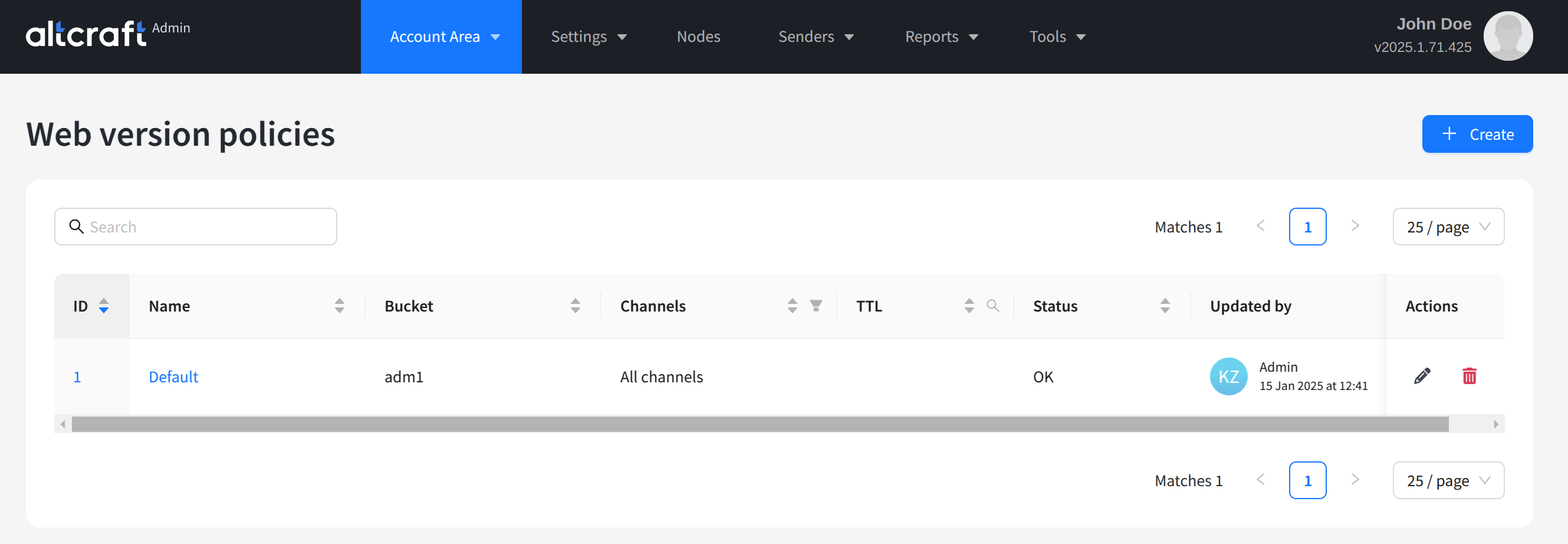 The list displays existing policies. On the right side of the table are the edit and delete buttons. To edit, click the policy identifier or name. To create a new policy, click + Create: