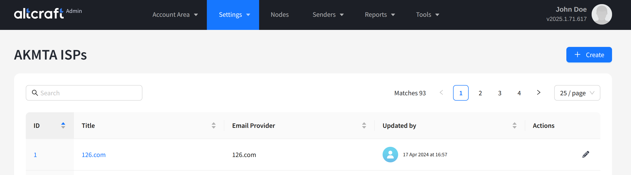The opened list displays existing ISP records in the AKMTA module. For most email providers, entries already exist in the default AKMTA configuration. To edit an existing ISP record, click the quick action button on the right side of the list or the record identifier on the left. To create a new record, click + Create: