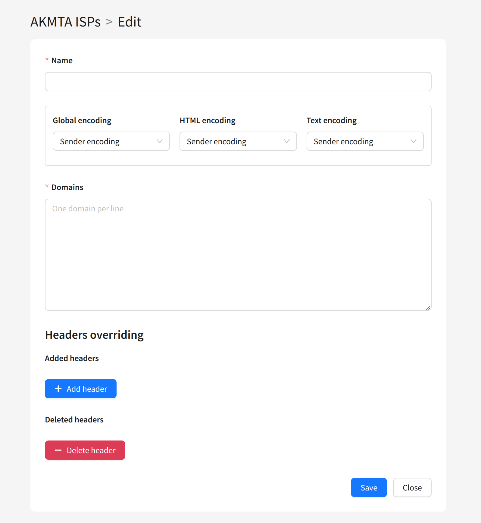 To manage email providers, in the main menu select Settings — MTA — ISPs.