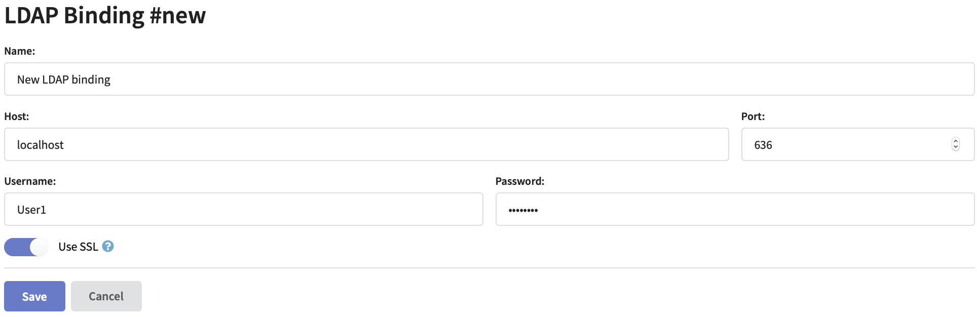 Specify LDAP connector name, directory server network address and port. Enter Username and Password for directory server database access. If you are planning to use a secure connection activate Use SSL option and set up directory service SSL certificates.