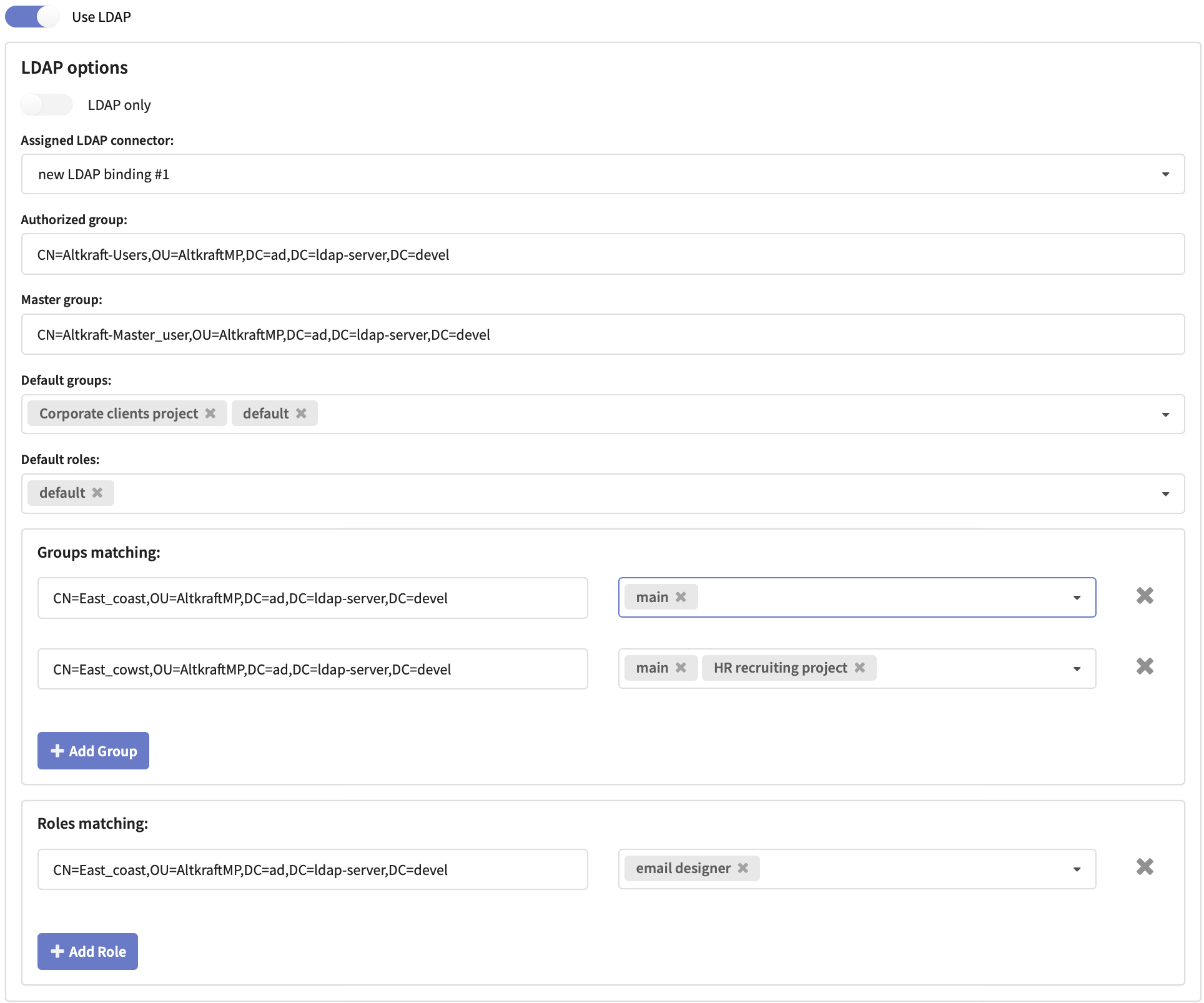 LDAP only option restricts Altcraft login and password authorisations. All requests will be processed via LDAP to directory service.