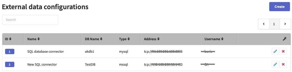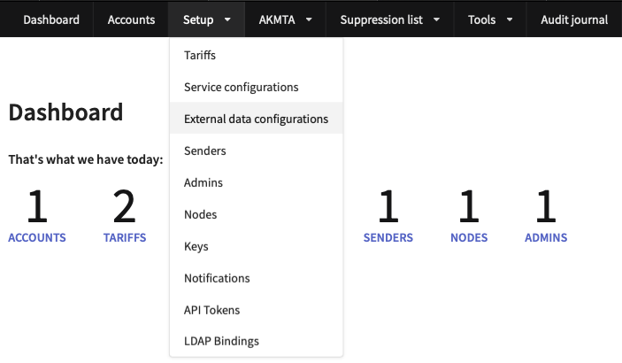 To connect to an SQL server, in Administrative panel select Setup → External data configurations.