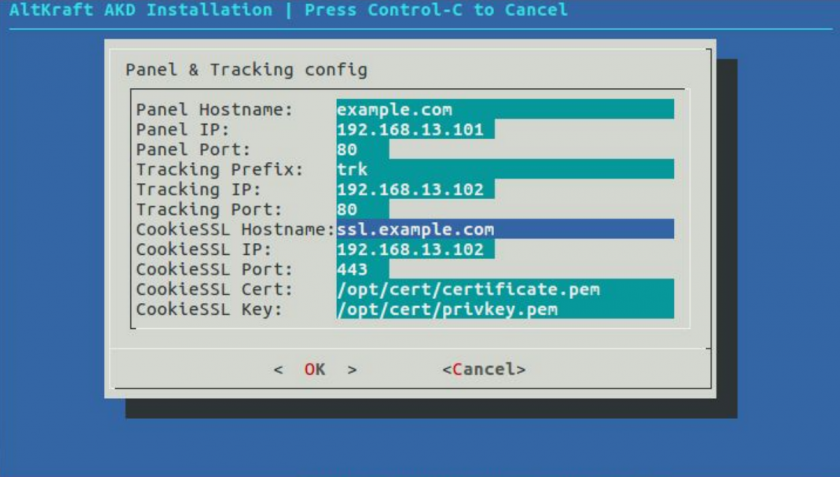 Then you will see Panel & Tracking configuration screen. Specify domains, IP addresses and ports for user interface, tracking and cookiesaver — along with SSL certificate for the latter. Technology description can help you with default ports and domains description.