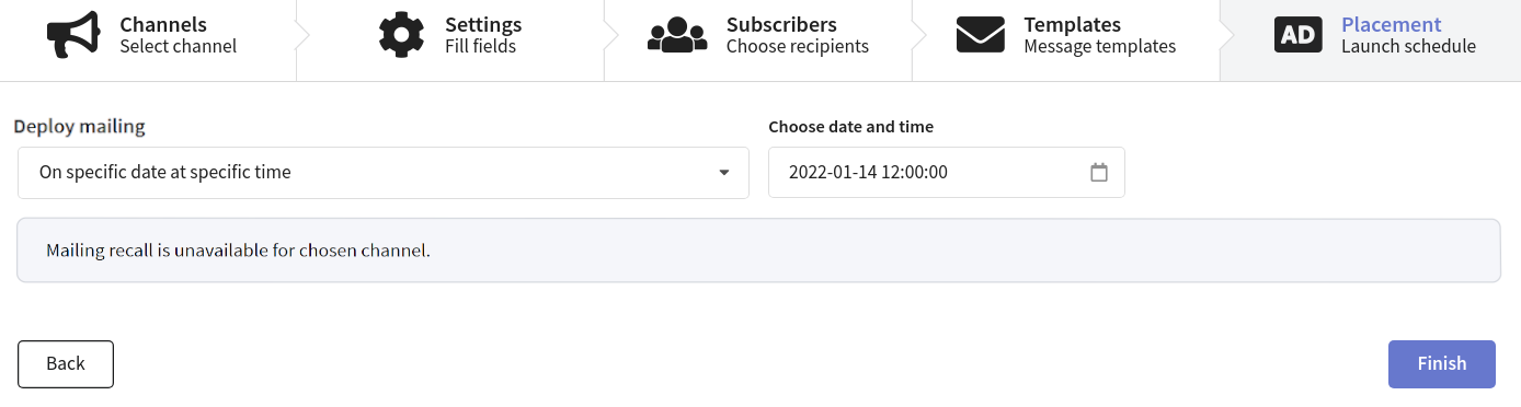 If you are using a placement campaign to send messages through a custom channel, the campaign settings may vary depending on the channel configuration. For example, some channels may require selecting only the resource without specifying the subscriber source.