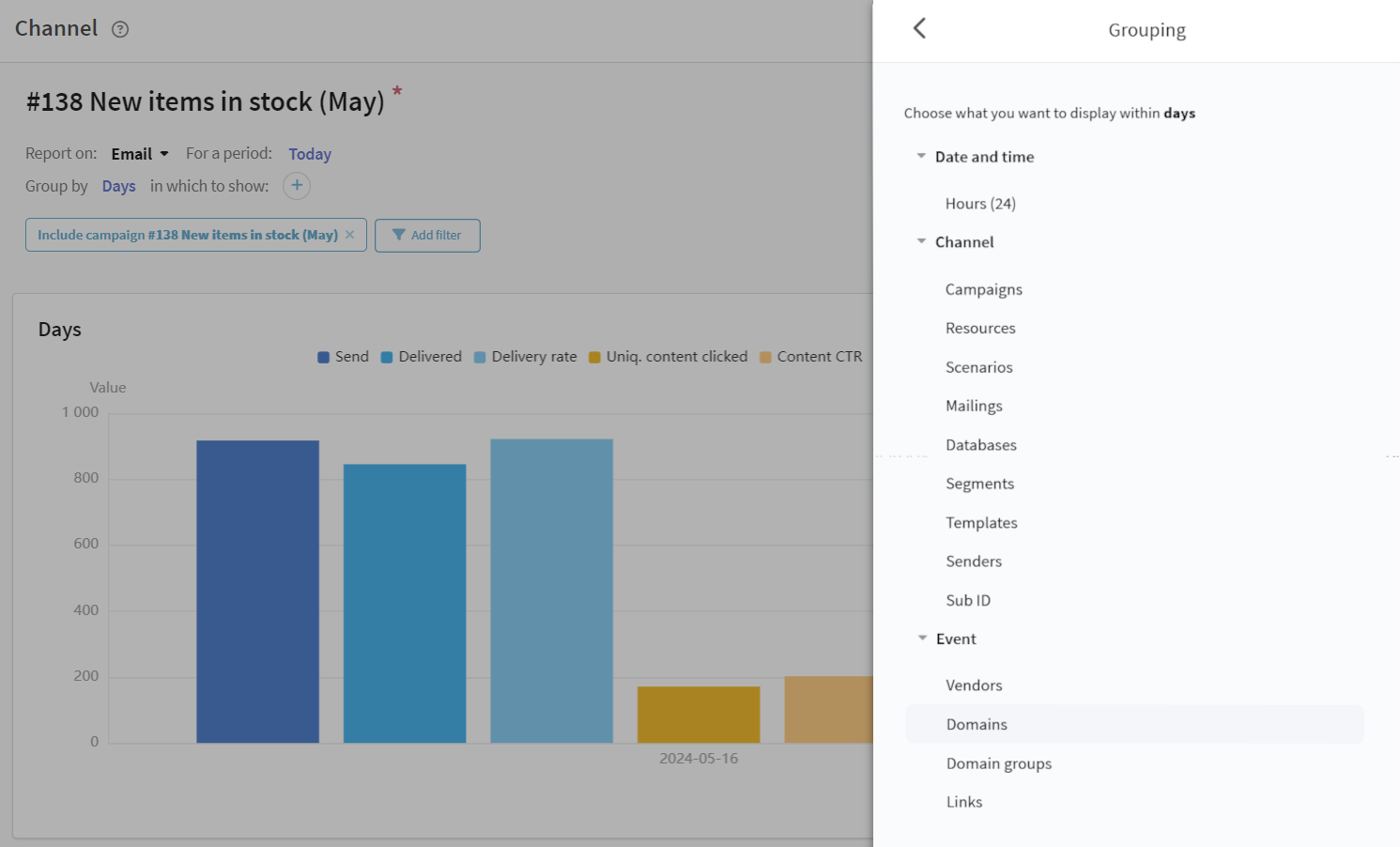 The channel report provides analytics for one or several campaigns, for one or several communication channels. For the convenience of grouping, you can select a preset of indicators for Email: