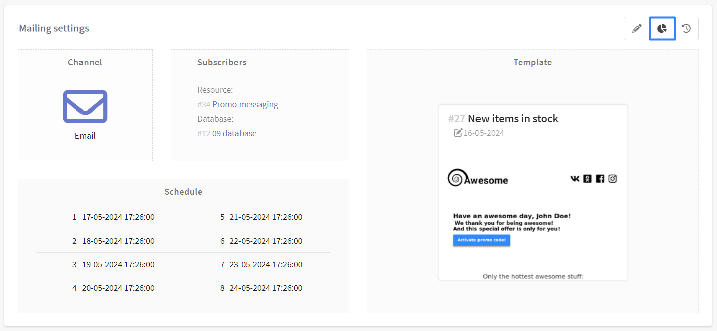 Once the campaign is set up, save it. Later you can find it in the list of campaigns of the corresponding type. There is a quick action menu on the right side of each campaign. Use it to test the campaign — and if everything is successful, activate it: