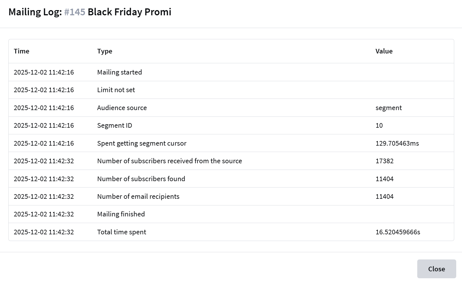 | Campaign started | The start time of the email campaign execution |