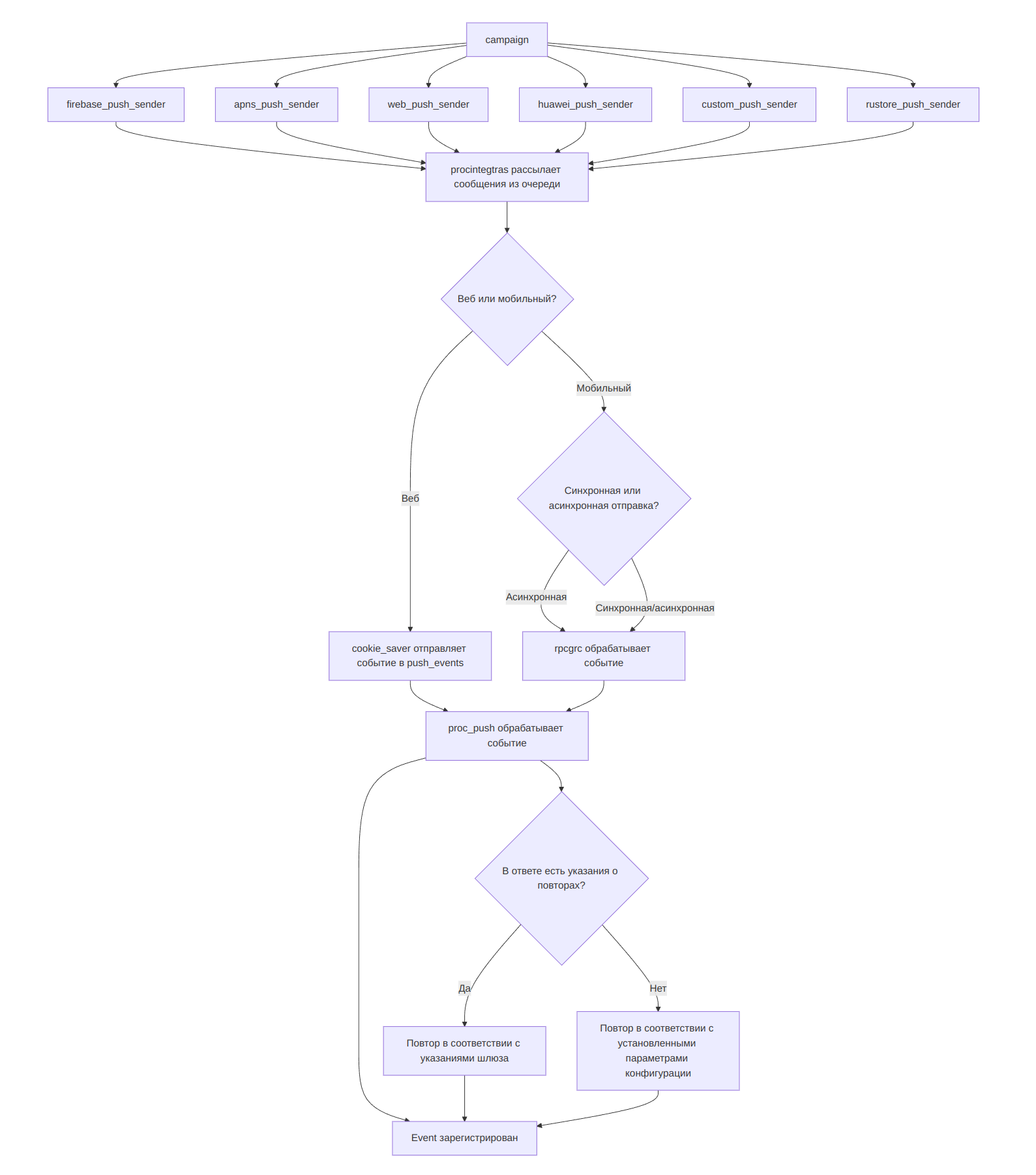 Регистрация статусов для мобильных push происходит схожим образом, главное отличие в том, что обработка асинхронных отправок происходит в очереди push_events, а синхронные сразу обрабатываются сервисом procrpc.