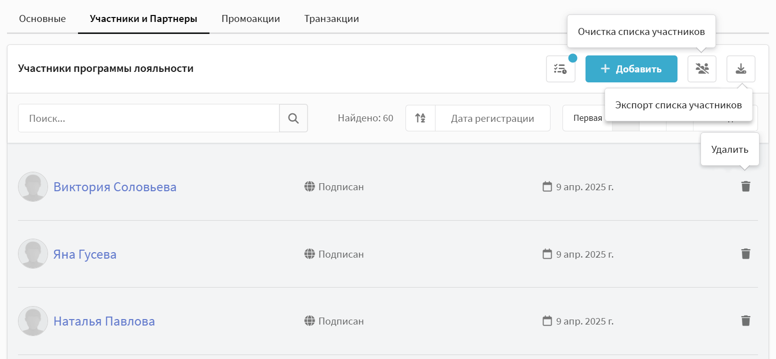 Раздел Участники и партнеры предназначен для управления базой участников программы лояльности (конечных пользователей) и партнеров (компаний, предоставляющих дополнительные преимущества участникам).