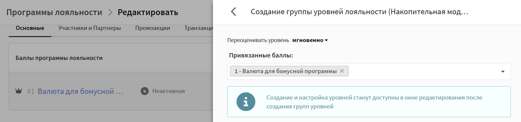 Привязка к группе уровней — позволяет связать балл с определенной группой уровней лояльности (например: Bronze, Silver, Gold). Это может быть использовано для настройки разных правил начисления или курса в зависимости от уровня клиента.