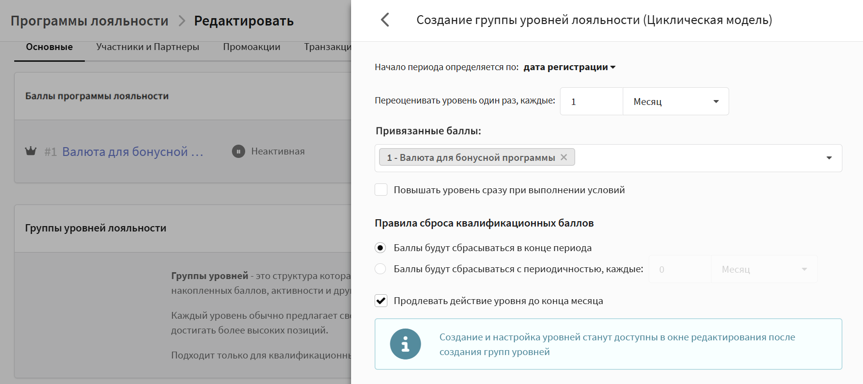 - Также можно включить опцию "Продлевать действие уровня до конца месяца" — уровень сохранится до завершения текущего календарного месяца, даже если участник не выполнил условия для его поддержания;