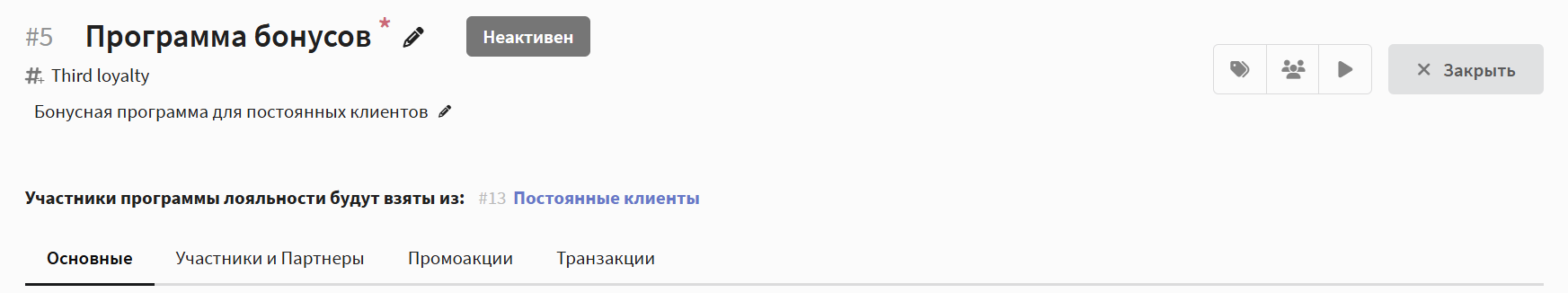 После создания вы попадете в редактор программы лояльности. Он состоит из нескольких вкладок: Основные, Участники и партнеры, Промоакции и Транзакции: