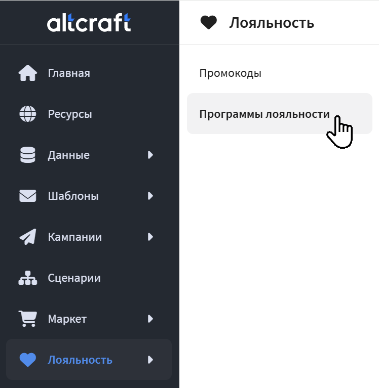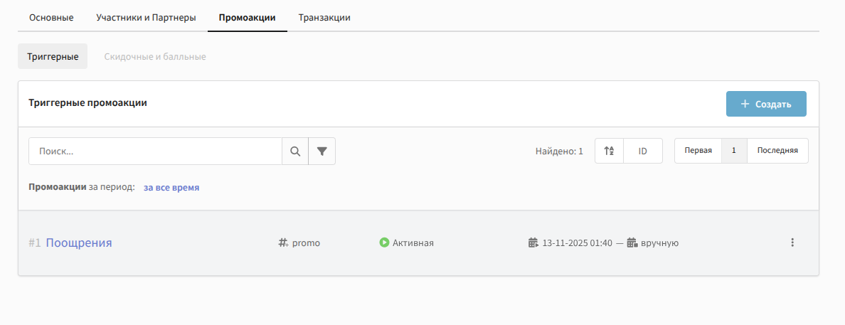 Раздел Промоакции предназначен для создания и управления триггерными акциями, которые используются в сценариях и рассылках для начисления или списания баллов лояльности.