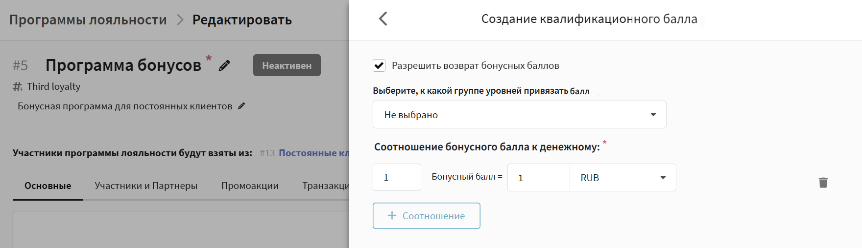 Разрешить возврат бонусных баллов — позволяет возвращать бонусные баллы участнику, например, при возврате товара или отмене услуги.
