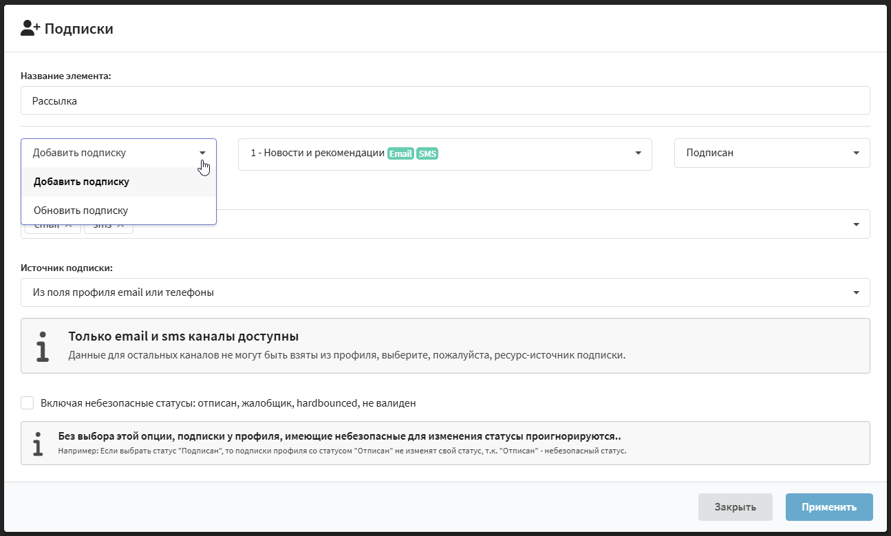 Подписка на новый канал в ресурсе — добавлена подписка на новый (для профиля) канал в ресурсе. То есть, была подписка на email рассылки, добавилась ещё и на SMS или Push.