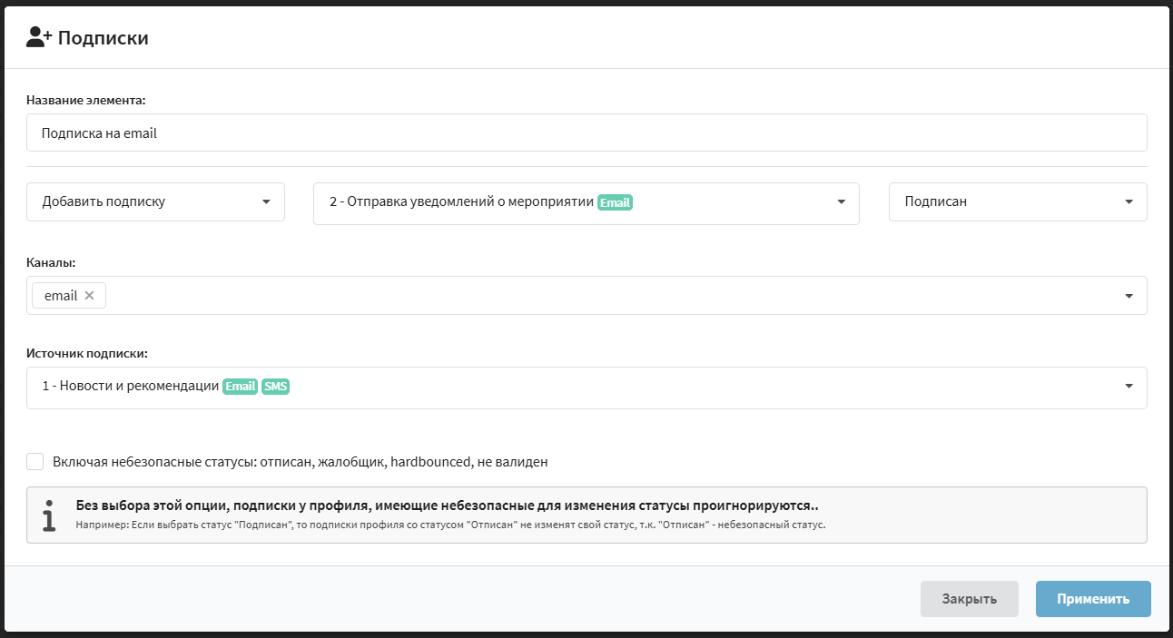 С помощью этого элемента вы также можете изменить глобальный статус профиля. Если вы разрешите небезопасные изменения статусов, то элемент будет обновлять профили со статусами, отличными от "Подписан".