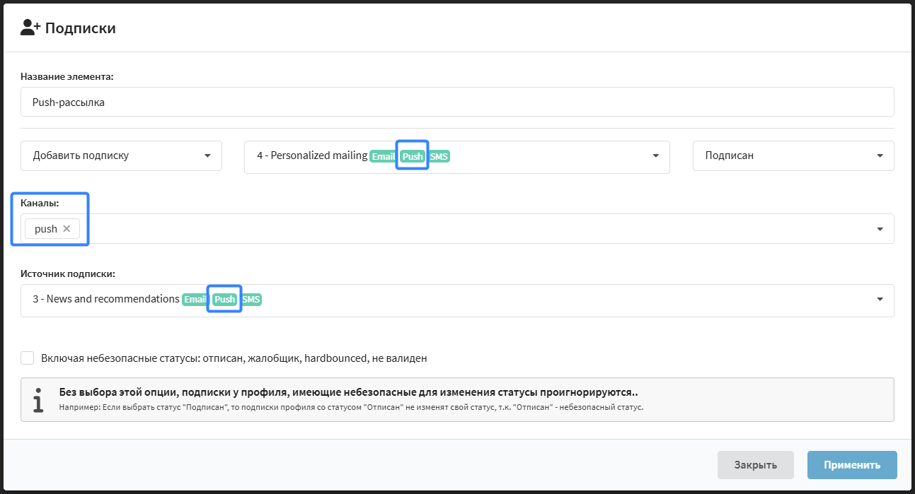 - Каналы — элементы, с помощью которых профилю отправляется сообщение.