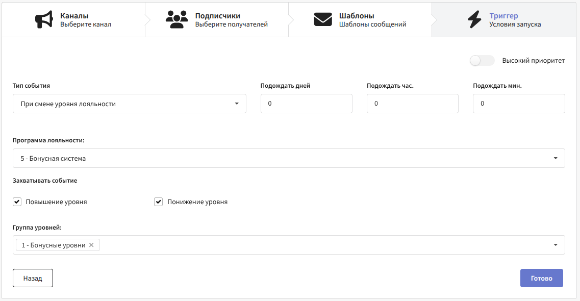 Внутри канала также можно установить приоритет отправки опцией Высокий приоритет. В этом случае задачи на генерацию контента обрабатываются в отдельной приоритетной очереди в брокере (oxy_triggers_prior), что позволяет быстрее подготовить сообщение.