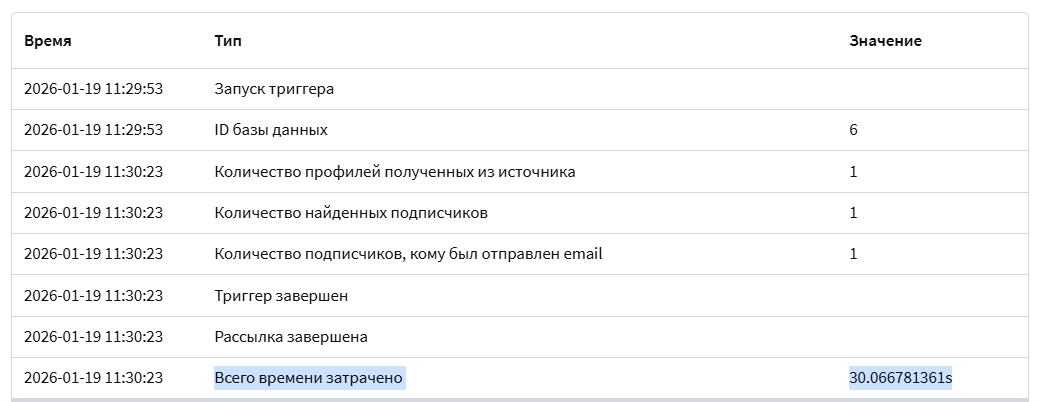 Для триггерных рассылок значение "Всего времени затрачено" фиксируется в момент завершения кампании, а не в момент фактической отправки конкретного сообщения. В течение этого интервала триггер продолжает принимать новые события, после чего завершается и записывает общую статистику за период.