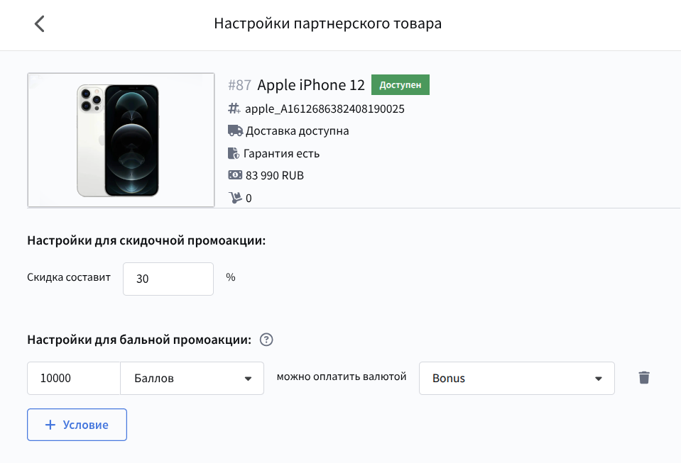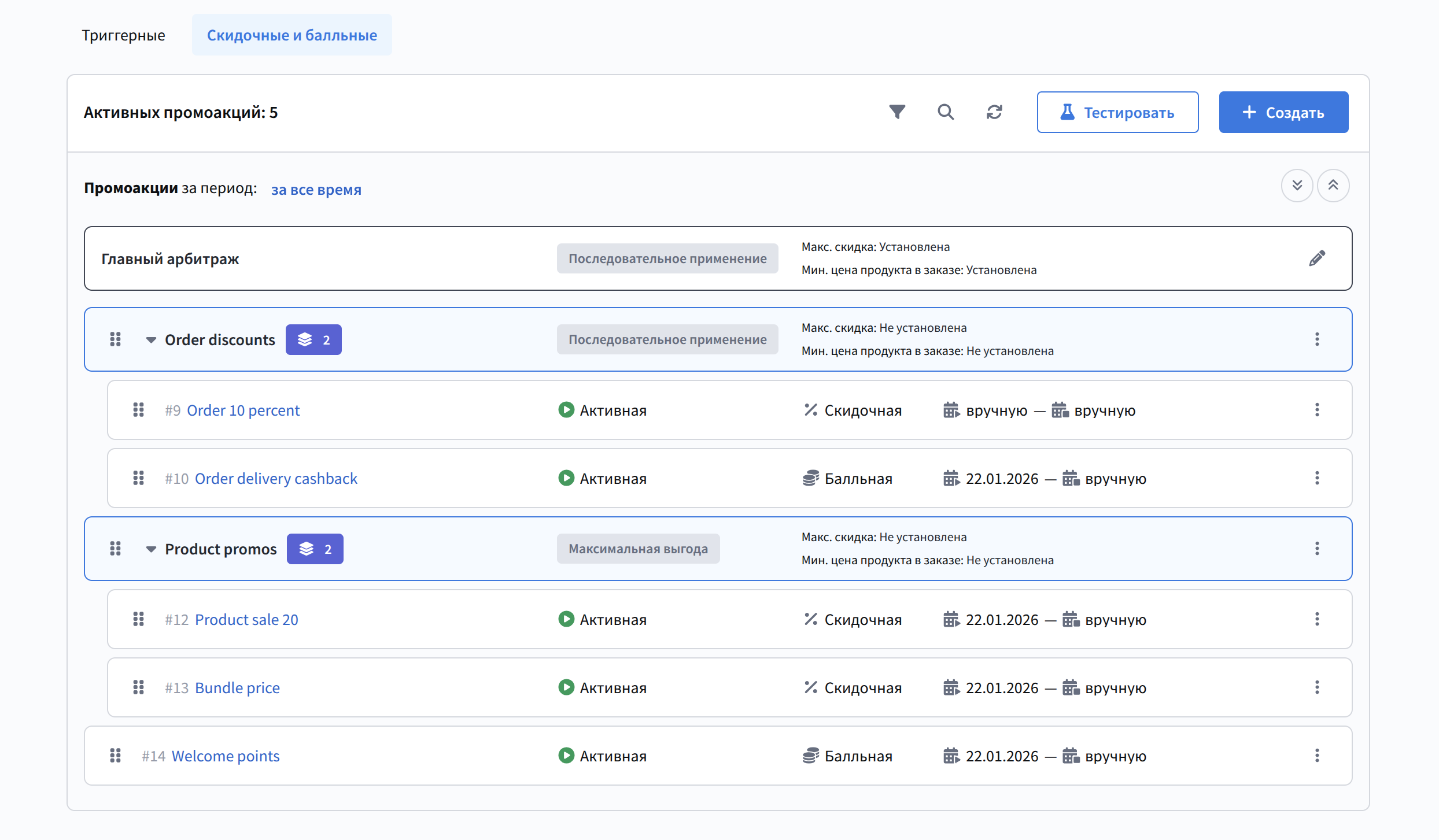 А скидочные и балльные промоакции отвечают за поощрения при заказе продуктов из Маркета. Пользователь может создать сразу несколько подобных акций и тонко настроить их взаимодействие при помощи арбитража: