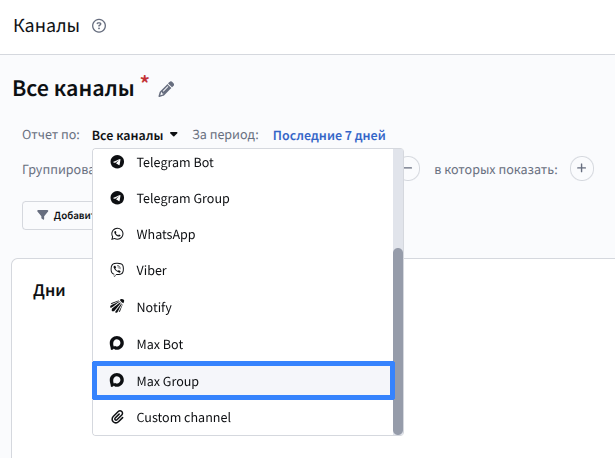 Для группировки по каналу выберите Отчет по: MAX Group