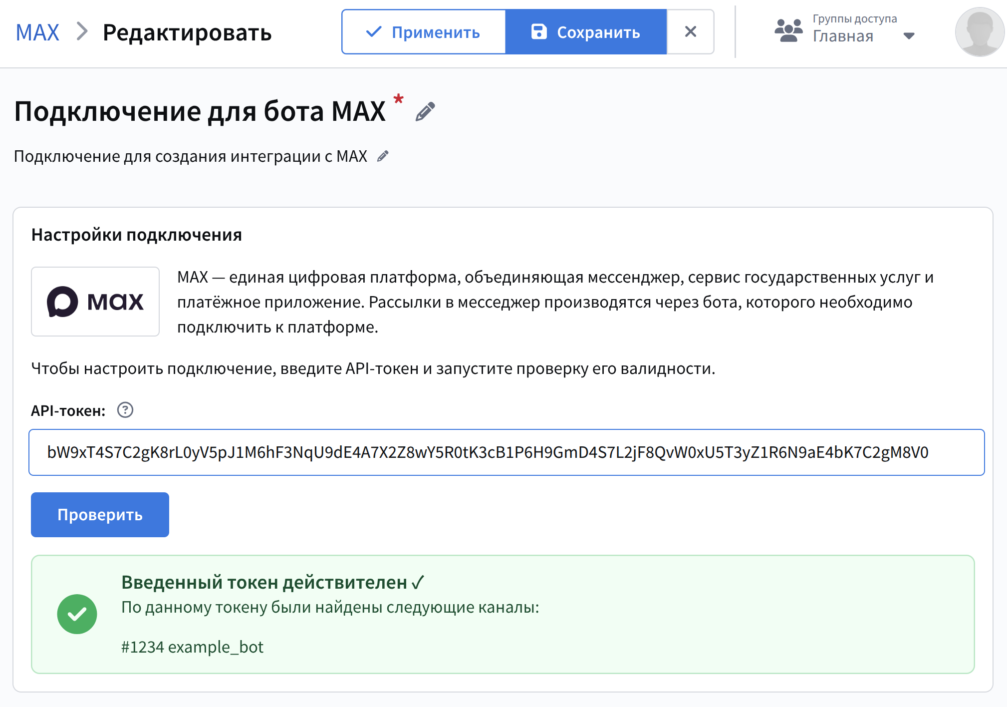 В поле API-токен вставьте токен, полученный на платформе MAX, затем нажмите Проверить. Если данные указаны корректно, платформа покажет сообщение об успешной проверке.