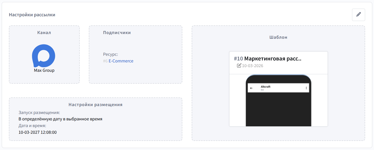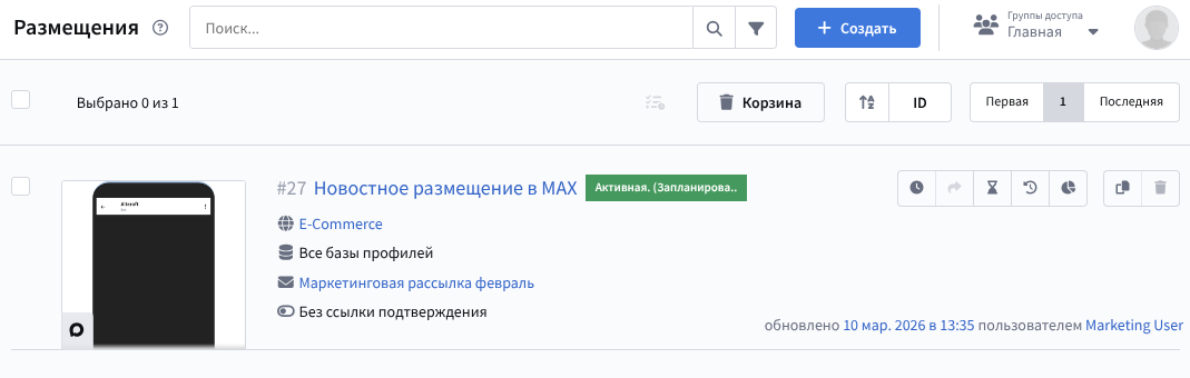 По окончании настройки сохраните рассылку. Она будет отображаться в общем списке рассылок. В правой части каждой записи есть меню быстрых действий. С его помощью вы можете активировать размещение :