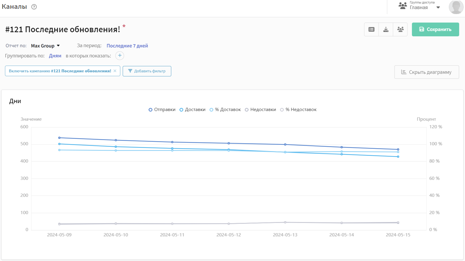 Для оценки результатов текущей рассылки вы можете просмотреть отчет по каналу. Отчет по каналам предоставляет аналитику по одной или нескольким рассылкам.